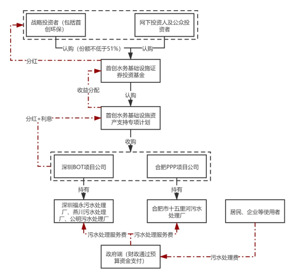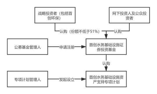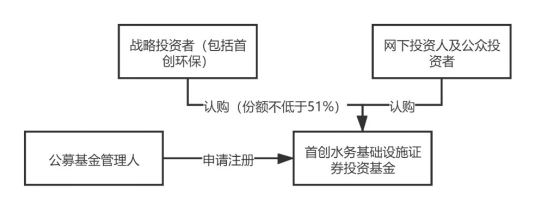 具體實(shí)施步驟為:首先,公募基金管理人富國(guó)基金向證監(jiān)會(huì)申請(qǐng)注冊(cè)首創(chuàng)水務(wù)基礎(chǔ)設(shè)施證券投資基金,取得注冊(cè)文件后,富國(guó)基金將基礎(chǔ)設(shè)施證券投資基金進(jìn)行公開(kāi)發(fā)售,其中首創(chuàng)環(huán)?;蚱渫豢刂葡玛P(guān)聯(lián)方作為戰(zhàn)略配售投資人參與認(rèn)購(gòu)比例不低于本次基金份額發(fā)售數(shù)量的51%(實(shí)際發(fā)行時(shí)認(rèn)購(gòu)比例為51%)。