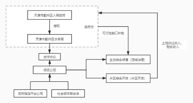 項(xiàng)目運(yùn)作模式和架構(gòu)。2019年5月,天津市薊州區(qū)人民政府發(fā)布《關(guān)于印發(fā)薊運(yùn)河(薊州段)全域水系治理、生態(tài)修復(fù)、環(huán)境提升及產(chǎn)業(yè)綜合開發(fā)EOD項(xiàng)目總體方案和市場化實(shí)施方案的通知》,對(duì)薊運(yùn)河(薊州段)EOD項(xiàng)目進(jìn)行總體部署。當(dāng)年8月,項(xiàng)目中標(biāo)候選人公示,中交天津航道局有限公司、中交疏浚(集團(tuán))股份有限公司、中交生態(tài)環(huán)保投資有限公司、中交第四航務(wù)工程勘察設(shè)計(jì)院有限公司與中交(天津)生態(tài)環(huán)保設(shè)計(jì)研究院有限公司聯(lián)合體為本項(xiàng)目的第一中標(biāo)候選人,項(xiàng)目工期為20年,中標(biāo)額約為65億元。該項(xiàng)目目前已順利確定社會(huì)資本方,已進(jìn)入項(xiàng)目執(zhí)行階段。