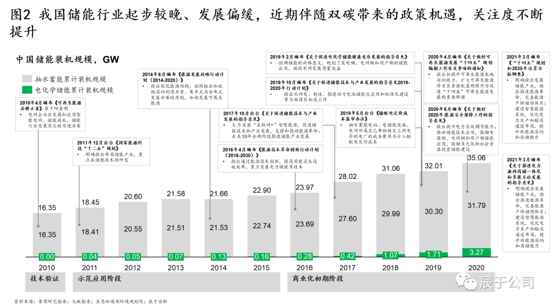 我國在儲能產(chǎn)業(yè)的戰(zhàn)略布局開始于2005年出臺的《可再生能源發(fā)展指導(dǎo)目錄》。經(jīng)過十多年的發(fā)展,目前儲能方面的政策已日趨完善,儲能發(fā)展已從研發(fā)示范向規(guī)?;?、市場化應(yīng)用轉(zhuǎn)變。