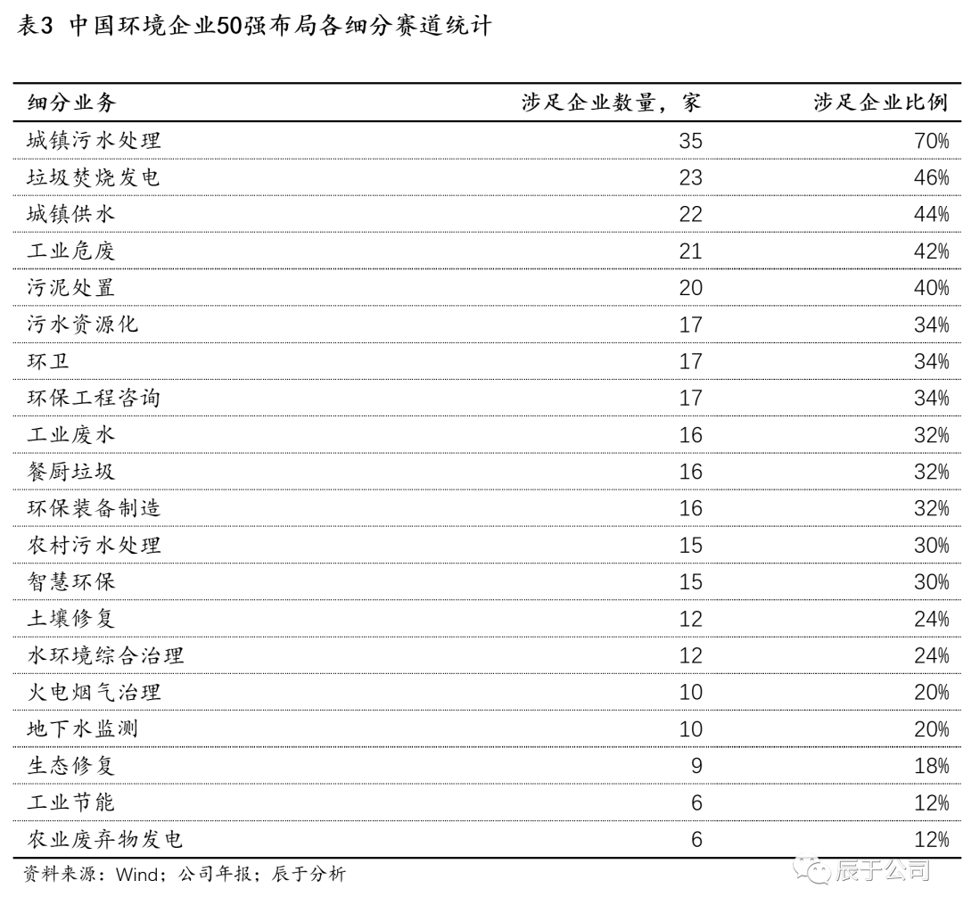 更細(xì)分去看,城鎮(zhèn)污水處理、垃圾焚燒發(fā)電、城鎮(zhèn)供水、工業(yè)危廢等是中國環(huán)境企業(yè)50強布局最多的細(xì)分領(lǐng)域(見表3),這些領(lǐng)域基本都是規(guī)模上千億甚至數(shù)千億的市場,“盤子”足夠大,商業(yè)模式穩(wěn)定,是環(huán)境強企必爭之地。