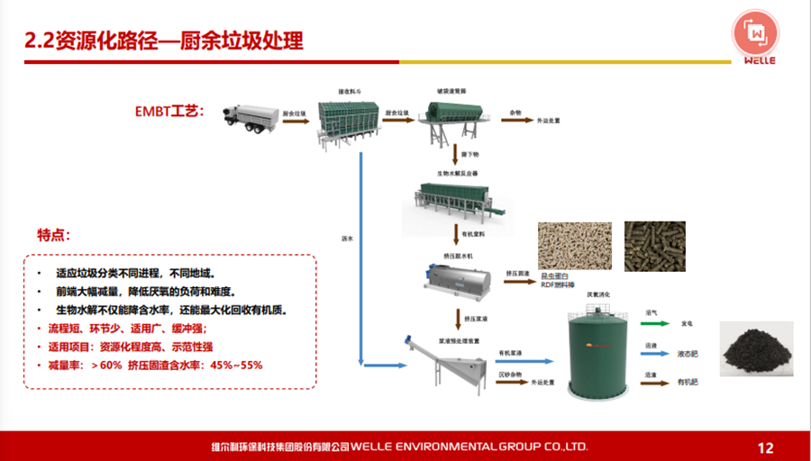 對于有機廢棄物的原料及核心技術,可以說從城市有機廢棄物到農(nóng)村有機廢棄物,現(xiàn)在最核心的還是通過厭氧發(fā)酵技術,最終通過沼氣化利用,達到無害化或者是環(huán)?;?,再盡可能實現(xiàn)資源化。國家發(fā)改委推出了一百個餐廚垃圾處理試點項目,之后進行全方位地推出。在國內(nèi)真正運行好的餐廚垃圾項目并不是特別多,主要工藝還是以厭氧為主。為什么這塊資源化的效率會好一些?尤其在“碳減排”的壓力下,使得出口價格一直比較好,這個行業(yè)最近稍微能夠掙點錢。另外,更深度的資源化利用,比如做有機質,食用的昆蟲養(yǎng)殖,也會有一些收益,再加上沼氣的收益。對于餐廚垃圾處理,我認為如果到了一定規(guī)模,收益還是不錯的。相對來說,廚余垃圾的資源化利用效率會差一些?,F(xiàn)在全國都在推行垃圾分類,不同城市廚余垃圾的質量相差比較大。如上海的廚余垃圾含水率、油脂含量與餐廚垃圾是有一點類似的,含油量可能稍微小一點,但在其他城市就相差非常大。廚余垃圾資源化是節(jié)省能源化的利用,以無害化為主,有一些也可以做食用昆蟲的養(yǎng)殖。 對于濕垃圾或者是廚余垃圾,我們特別推出一款技術——EMBT技術。結合生物水解技術,原理是有機廢棄物或者有機物在厭氧發(fā)酵過程當中主要是通過酸化水解以及產(chǎn)甲烷兩個階段,我們通過設施化的反應器,把酸化水解在前面就能夠作為預處理,真正地溶解到水下面的有機物再到厭氧處理,這樣使得厭氧反應器不要那么復雜,剩下的固渣資源化也會比較方便,去做水量化的利用都是可行的。這個工藝現(xiàn)在在上海包括在紹興做下來,還是受到比較多的認可。
