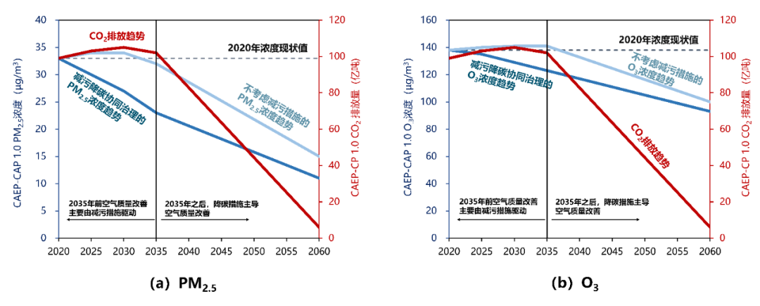 2.1 大氣環(huán)境治理與碳減排的協(xié)同路徑與思路我國大氣污染與 CO2 排放同根同源,具備協(xié)同治理的巨大潛力。從中長期來看,應(yīng)科學(xué)研判不同歷史時(shí)期減污與降碳的主要驅(qū)動(dòng)力,系統(tǒng)謀劃協(xié)同減排路徑。從區(qū)域?qū)用鎭砜?,?yīng)著重關(guān)注大氣污染嚴(yán)重的地區(qū),這些地區(qū)通常也是碳排放量大的區(qū)域。從行業(yè)和部門層面來看,重化工業(yè)、交通運(yùn)輸、民用等均是大氣污染物和 CO2 排放的主要來源,應(yīng)作為協(xié)同治理的重點(diǎn)予以關(guān)注。此外,推動(dòng)城市空氣質(zhì)量達(dá)標(biāo)和碳排放達(dá)峰“雙達(dá)”試點(diǎn)示范,探索典型城市實(shí)現(xiàn)“雙達(dá)”的主要路徑、關(guān)鍵措施、政策機(jī)制,也是有益嘗試。已有研究表明 [12, 13, 16],碳達(dá)峰碳中和目標(biāo)愿景對驅(qū)動(dòng)空氣質(zhì)量改善有巨大貢獻(xiàn)。如圖 3 所示,在碳達(dá)峰碳中和目標(biāo)的驅(qū)動(dòng)下,全國 PM2.5年均濃度和 O3 濃度年評價(jià)值(日最大 8 小時(shí)濃度均值的第 90 百分位數(shù))有望在 2060 年左右達(dá)到世界衛(wèi)生組織 2005 版空氣質(zhì)量準(zhǔn)則值(PM2.5年均濃度小于 10 μg/m3,O3日最大 8 小時(shí)濃度均值小于 100 μg/m3),屆時(shí)降碳對減污(PM2.5)的累計(jì)貢獻(xiàn)將超過 80%[12]。在 2030 年實(shí)現(xiàn)碳達(dá)峰目標(biāo)之前,需要堅(jiān)持以美麗中國目標(biāo)和碳達(dá)峰目標(biāo)為雙牽引,持續(xù)強(qiáng)化大氣污染治理措施,特別是揮發(fā)性有機(jī)物(VOCs)排放相關(guān)的源頭替代等措施,實(shí)現(xiàn) PM2.5和 O3污染協(xié)同控制以及與碳減排的協(xié)同;這一階段,減污目標(biāo)將推動(dòng)中國獲得額外的降碳收益 [16]。2035 年以后,隨著大氣污染物末端治理技術(shù)進(jìn)一步減排的潛力逐步收窄,根本性的結(jié)構(gòu)調(diào)整等降碳措施將成為 CO2 與大氣污染物協(xié)同減排的核心牽引,降碳措施將主導(dǎo)減污的進(jìn)程[12,17]。
