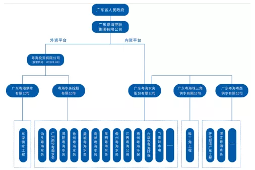 1987年,粵海集團(tuán)收購(gòu)香港上市公司友聯(lián)世界的控制權(quán),并于1988年將其改名為粵海投資,粵海投資也因此成為全國(guó)駐港首家在港上市企業(yè)。其在環(huán)境領(lǐng)域主要聚焦供水領(lǐng)域,涉及原水供應(yīng)、自來(lái)水經(jīng)營(yíng)、污水處理和水環(huán)境治理全產(chǎn)業(yè)鏈,提供從投資到運(yùn)營(yíng)管理的綜合一體化服務(wù)。外資平臺(tái)以香港上市公司粵海投資為主體,內(nèi)資平臺(tái)以廣東粵海水務(wù)股份有限公司為主體。具體如下: