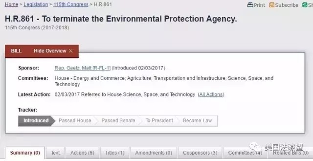 2017-02-14 中國環(huán)境新聞2017年2月3日,美國國會公布了一份來自國會參議員的提案,名稱為《撤銷環(huán)境保護局》(To terminate the Environmental Protection Agency),提議在2018年底撤銷國家環(huán)境保護局。What ? 在環(huán)境議題已經(jīng)在全世界廣受關注的時候,居然會有人提議撤銷環(huán)保局!美國國會網(wǎng)站公布的“關于撤銷環(huán)境保護局議案”這份“撤銷環(huán)境保護局”的議案由來自佛羅里達州第一選區(qū)的參議員馬特?蓋茨(Matt Gaetz)牽頭提出,該議案同時有另外三名共和黨議員聯(lián)名附屬簽名提出。