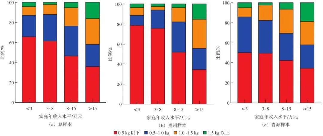 不同地區(qū)在垃圾分類管理模式的選擇上應(yīng)有所側(cè)重。以卡方檢驗分析兩地受訪者對管理模式的選擇差異,見圖5(d),兩地樣本在“分類獎勵”和“道德約束”兩項的選擇差異不顯著,而“強制懲罰”和“督導(dǎo)員指導(dǎo)”兩項的選擇存在顯著差異,因此強制型和引導(dǎo)型管理的側(cè)重更值得關(guān)注。青海居民更傾向于選擇“強制懲罰”(P<0.05),可能因為青海的環(huán)境衛(wèi)生壓力和居民參與意愿相對較高。同時選擇“懲罰力度較低”的比例相對較高(圖3),當(dāng)?shù)貞土P力度不足問題可能更突出,建議青海相對側(cè)重加強強制型管理。貴州居民更傾向于選擇“督導(dǎo)員指導(dǎo)”(P<0.05),貴州居民參與意愿和政策認識水平相對較低,可能更需要督導(dǎo)員的專門指導(dǎo),建議貴州相對側(cè)重加強引導(dǎo)型管理。