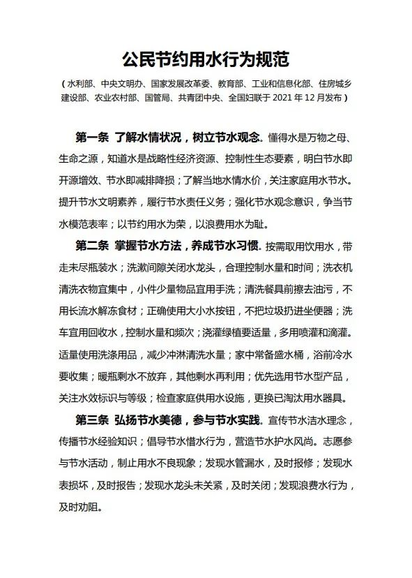 三是積極踐行水利部、中央文明辦等 10 部門聯(lián)合發(fā)布的《公民節(jié)約用水行 為規(guī)范》。用自己的文明言行勸導、糾正身邊的不良行為,形成節(jié)水的新常態(tài)。