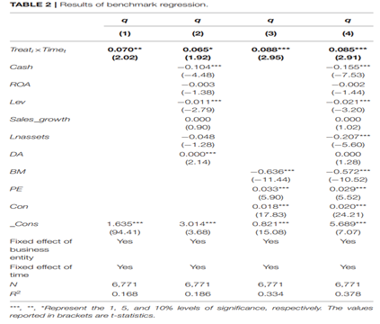 基準(zhǔn)回歸結(jié)果如下表所示,由回歸結(jié)果可知,無論是否加入控制變量,核心解釋變量的系數(shù)均顯著為正,表明綠色金融試點(diǎn)政策顯著提升了試點(diǎn)地區(qū)綠色企業(yè)的長(zhǎng)期價(jià)值。