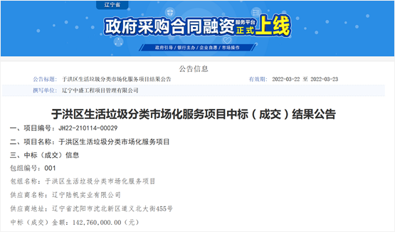 遼寧省政府采購網(wǎng)消息,2022年3月22日,沈陽市于洪區(qū)生活垃圾分類市場(chǎng)化服務(wù)項(xiàng)目公布開標(biāo)結(jié)果,成交價(jià)1.4276億元。
