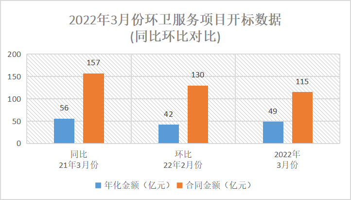 受疫情影響,三月份全國范圍環(huán)衛(wèi)服務(wù)項目大面積暫停招標(biāo)或推遲開標(biāo),與去年同期(同比)及今年二月份(環(huán)比)相比,環(huán)衛(wèi)服務(wù)項目成交年化額及合同額均出現(xiàn)不同程度下降。