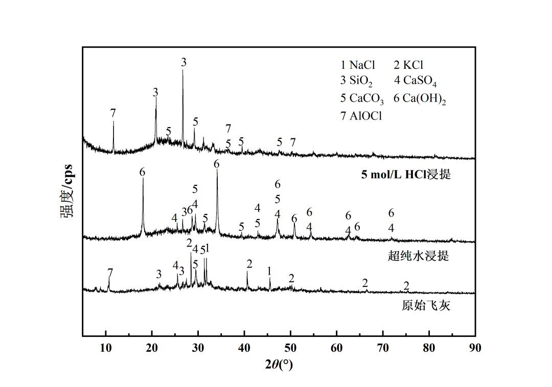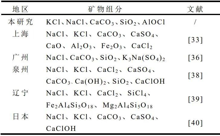 與不同地區(qū)飛灰礦物相組分對比,由表3可知,不同地區(qū)飛灰均含有碳酸鹽和硅酸鹽,且含有NaCl、KCl等可溶性氯鹽,Na、K元素來源于餐飲中食鹽等調(diào)味料的添加,高含量Cl-來源于爐排爐高溫焚燒下無機氯鹽的揮發(fā)以及垃圾成分中的廚余垃圾、塑料制品。相較于其他地區(qū),本研究還檢測到不溶氯AlOCl組分,可能是由于飛灰中Al2O3與焚燒煙氣中的酸性氣體反應生成。