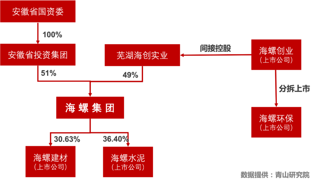 要想讀懂海螺環(huán)保,首先得搞懂隱在其身后的海螺帝國(guó),而要搞懂海螺帝國(guó),最好的方法就是厘清海螺系的主體海螺集團(tuán)和其中海螺環(huán)保、海螺創(chuàng)業(yè)、海螺水泥、海螺型材四家上市公司的關(guān)系,因?yàn)檫@其中蘊(yùn)藏著這個(gè)商業(yè)帝國(guó)的個(gè)性。海螺集團(tuán)是國(guó)務(wù)院120家大型試點(diǎn)企業(yè)集團(tuán),我國(guó)最大的建材企業(yè)集團(tuán)之一,世界500強(qiáng)企業(yè),是安徽省國(guó)企當(dāng)中首屈一指的龍頭,甚至一度被稱為安徽的脊梁。其控股股東是安徽省國(guó)資委,間接持股51%,而另外的49%則是由本次分拆上市事件的主體海螺創(chuàng)業(yè)間接持有,是一家由國(guó)資控股的混合所有制企業(yè)。海螺集團(tuán)手握兩家上市公司,分別是聲名赫赫的海螺水泥和海螺型材。 海螺水泥: