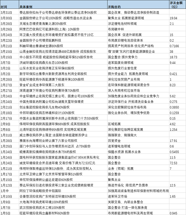 如泰達(dá)股份向子公司泰達(dá)綠色環(huán)保轉(zhuǎn)讓泰達(dá)潔凈5%股權(quán),就是為了推動(dòng)泰達(dá)潔凈進(jìn)行股份制改造;皖能股份接盤控股股東安徽省能源集團(tuán)持有的安徽皖能環(huán)保發(fā)電有限公司51%股權(quán),是為了避免安徽能源集團(tuán)與皖能環(huán)保發(fā)電的同業(yè)競(jìng)爭(zhēng);武漢控股收購(gòu)武水工程100%股權(quán),是想打造“投建管運(yùn)”一體化服務(wù)商,更好地滿足新時(shí)代的環(huán)境治理需求;城發(fā)環(huán)境吸并啟迪環(huán)境,則是為了實(shí)現(xiàn)國(guó)企間的戰(zhàn)略整合;而北京環(huán)境引入戰(zhàn)略投資者,據(jù)說(shuō)是為了突破北京市場(chǎng),更好地走向全國(guó)。而洪城環(huán)境、山東水發(fā)、深高速環(huán)境公司的收購(gòu),則主要是為了增強(qiáng)企業(yè)整體以及在固廢包括危廢領(lǐng)域的競(jìng)爭(zhēng)優(yōu)勢(shì)。更多內(nèi)容見下表: