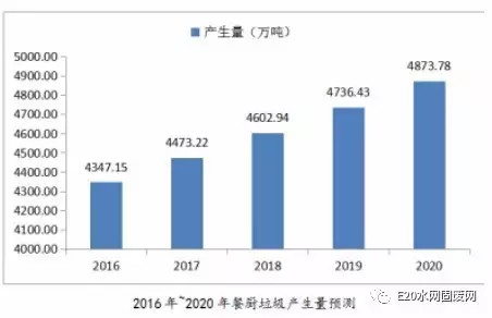 E20研究院的《餐廚垃圾處理市場分析報告(2016)》指出,近年來我國經(jīng)濟快速發(fā)展,餐廚垃圾以每年10%的增量不斷增長。按照城鎮(zhèn)人口每人每天產(chǎn)生0.15kg餐廚垃圾計算,我國2011年的餐廚垃圾產(chǎn)生量為3782萬噸,到2015年我國的餐廚垃圾產(chǎn)生量增長到了4222萬噸。我國餐廚垃圾處理行業(yè)也在2015年迎來了市場的集中爆發(fā)期。預計2016年我國餐廚垃圾的產(chǎn)生量為4347萬噸,到“十三五”末期,我國的餐廚垃圾產(chǎn)生量將增長至4873萬噸,餐廚垃圾處理形勢嚴峻。