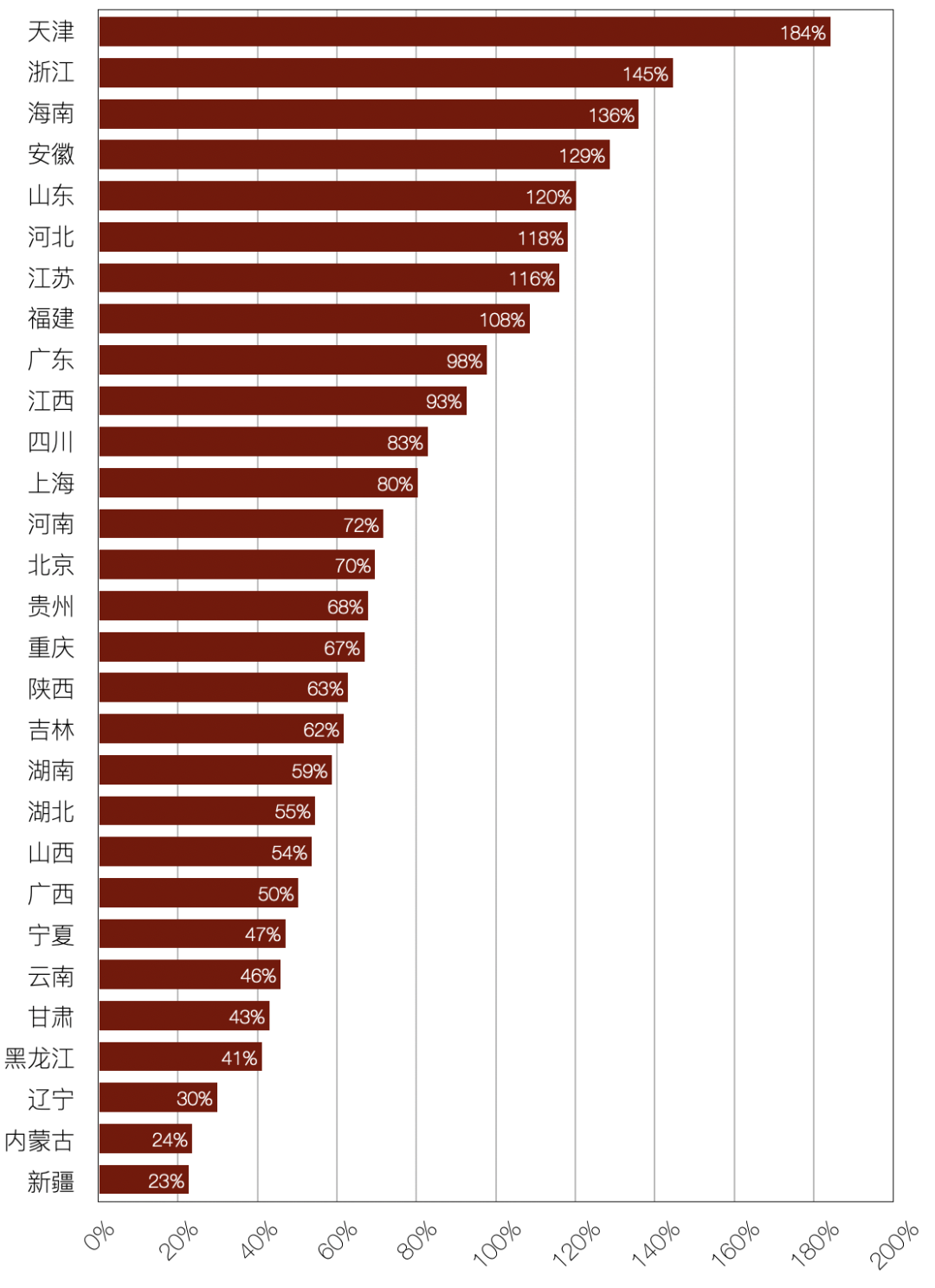 注:基于全國2019-2020年城市生活垃圾清運(yùn)量從24,206萬噸下降到23,512萬噸的事實(shí),項(xiàng)目團(tuán)隊(duì)認(rèn)為,在垃圾分類作用的影響下,城市生活垃圾清運(yùn)量將保持0增長或持續(xù)下降趨勢(shì),但考慮到鄉(xiāng)村生活垃圾收運(yùn)體系建設(shè)的持續(xù)推進(jìn),城鄉(xiāng)生活垃圾清運(yùn)量可能會(huì)保持短期內(nèi)持續(xù)增長,在下文計(jì)算中僅考慮城市、縣城生活垃圾清運(yùn)量可能會(huì)低估全社會(huì)生活垃圾產(chǎn)生量;第二,考慮到全國范圍內(nèi)一般以無害化處理設(shè)施(包括焚燒廠、填埋場、廚余垃圾處理設(shè)施)處理量計(jì)算清運(yùn)量,且并未全面統(tǒng)計(jì)鄉(xiāng)村(部分城鎮(zhèn))生活垃圾清運(yùn)量,垃圾焚燒設(shè)施目前主要的垃圾來源仍為城市、縣城垃圾;第三,使用2022年1月1日的生活垃圾焚燒處理能力計(jì)算2022年全年的“焚燒清運(yùn)比”,未考慮2022年投產(chǎn)的生活垃圾焚燒處理能力,所以會(huì)導(dǎo)致結(jié)果低估。綜上,本文最終選擇使用城市、縣城生活垃圾清運(yùn)量數(shù)據(jù)作為基數(shù),0%估算各省2022年生活垃圾清運(yùn)量。 天津市、浙江省、海南省、安徽省2022年的“焚燒清運(yùn)比”分別高達(dá)184%、145%、136%、129%,詳見圖5。