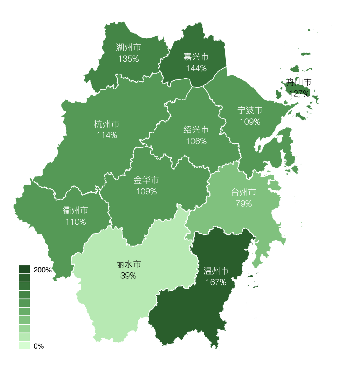 浙江省12個(gè)地級(jí)市分別以“全市”“全市城鎮(zhèn)”“市區(qū)”統(tǒng)計(jì)生活垃圾清運(yùn)量、處理量,據(jù)此計(jì)算“焚燒清運(yùn)比”可以發(fā)現(xiàn),浙江省內(nèi)生活垃圾“焚燒清運(yùn)比”存在區(qū)域內(nèi)不均的情況。其中溫州市、嘉興市“焚燒清運(yùn)比”分別高達(dá)167%、144%。詳見圖8。