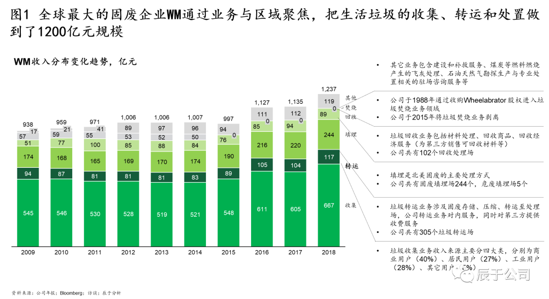美國WM的50年發(fā)展幾乎就是一個并購史,可分為四個階段(見圖4):1968~1984年全面鋪開階段,通過收購全美各地的小型垃圾收運公司提升市場地位,其中1972 年就進行了133 次收購,1984年收購北美廢物管理公司SCA之后,成為全美第一大垃圾運轉商;1988~1990年三輪驅動階段,確立了垃圾收集轉運、焚燒、回收利用“三輪驅動”的發(fā)展方式,通過并購垃圾焚燒能源公司W(wǎng)heelabrator和紙類回收運營商Stone Container等手段實現(xiàn);1993~1997年多元發(fā)展階段,WM意圖通過大舉并購開拓多元化市場,通過收購先后進入危廢、石棉移除、金屬腐蝕處理、草坪養(yǎng)護等市場,股價從1993年初的8.87美元上漲至1997年初的18.86 美元,漲幅達112%(不過事后證明這個階段的過度多元化并購是失敗的);1999年以后WM開始專注在核心業(yè)務+專業(yè)化新生業(yè)務的并購,其中核心業(yè)務收購了BFI(全美第二大固廢公司)在加拿大的全部業(yè)務和全美最大固廢第三方服務網(wǎng)絡運營商Oak Leaf Global Holdings,這些并購不僅鞏固了WM傳統(tǒng)市場的領先地 U7Y位,也完善了固廢處理全產(chǎn)業(yè)鏈布局。