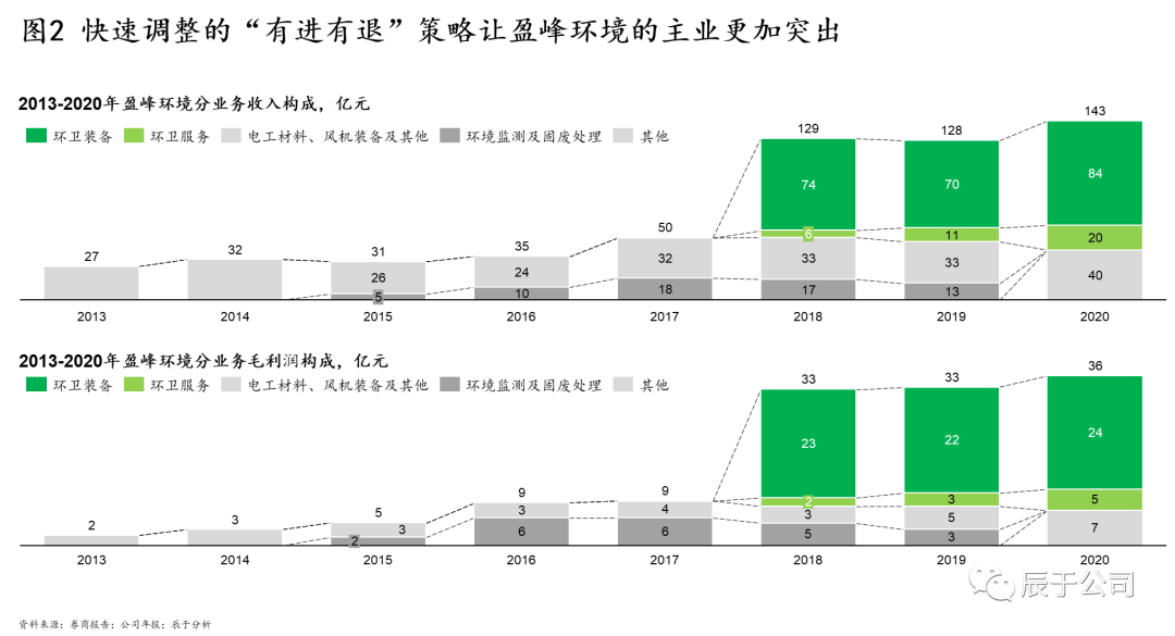 盈峰環(huán)境2015年進入環(huán)保產(chǎn)業(yè),經(jīng)歷過一系列小型并購但毫無起色的彎路之后,2018年開始聚焦環(huán)衛(wèi)行業(yè),當年以152.5億元全資收購中聯(lián)環(huán)境,正式進入環(huán)衛(wèi)裝備及環(huán)衛(wèi)運營一體化服務領域。收購完成后,環(huán)衛(wèi)裝備及環(huán)衛(wèi)服務業(yè)務的占比超過80%,成為公司的核心主業(yè),到2020年收入規(guī)模就達到了143億,幾乎是2017年49億的3倍(見圖2)。