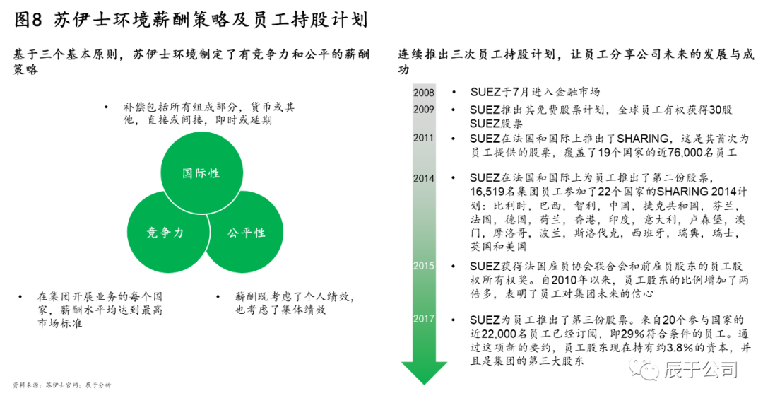 在員工保留方面,蘇伊士通過實施長短結合的薪酬政策吸引和激勵員工,并持續(xù)推出員工持股計劃讓員工分享公司的發(fā)展與成功。一方面,蘇伊士基于國際性、競爭性和公平性三個原則制定薪酬策略,確保薪酬政策符合當?shù)厥袌鲆?,同時也確保薪酬水平在當?shù)靥幱谳^高水平;另一方面,蘇伊士自2009年開始連續(xù)推出三次員工持股計劃,截至2017年底,員工股東持有約3.8%的股權,并且是集團的第三大股東(如圖8)。