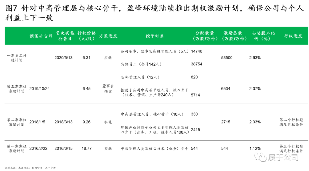 盈峰環(huán)境的掌舵人何劍鋒曾在多個場合下強調其發(fā)展的三個核心:訂單導向、技術創(chuàng)新、人才激勵。自2016年開始,盈峰環(huán)境多次推出人才激勵計劃,把握獎勵過去、激勵未來的核心觀念,不斷提高激勵總額度、擴大激勵對象與范圍、優(yōu)化業(yè)績考核要求,既完善了員工薪酬結構,提升了員工積極性與穩(wěn)定性,也實現(xiàn)了治理結構的優(yōu)化,保障管理層與公司利益的長期一致性(見圖7)。