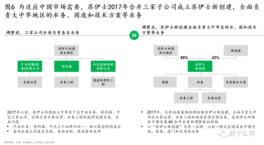 蘇伊士中國也在2017年對其組織架構進行了優(yōu)化。2017年以前,蘇伊士在大中華區(qū)下設中法水務、得利滿、升達三家公司,分別負責水務運營、水務工程和固廢廢物處理業(yè)務,由于三個品牌不統(tǒng)一、難以獲得協(xié)同效應,各業(yè)務之間各自為政、條塊分割,降低了整體效率。對此,2017年蘇伊士與新創(chuàng)建集團共同組建蘇伊士新創(chuàng)建,全面負責公司在大中華地區(qū)的水務運營、水務工程和固廢資源管理業(yè)務,這是蘇伊士在中國發(fā)展 40 余年后重新調整股權結構,同時以“蘇伊士新創(chuàng)建”為單一品牌,以統(tǒng)一模式管理其在中國內地、香港、澳門和臺灣的業(yè)務(見圖6)。2021年初對蘇伊士新創(chuàng)建和蘇渝兩家公司的股權收購則進一步強化了組織合力。
