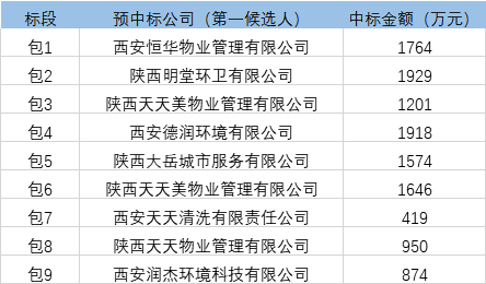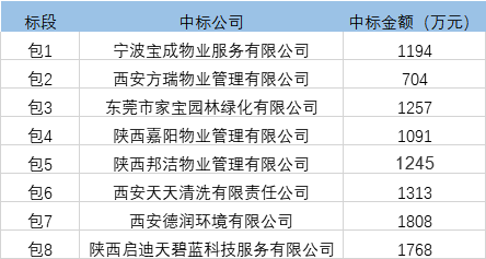 近日,西安市碑林區(qū)、未央?yún)^(qū)兩大億級(jí)環(huán)衛(wèi)項(xiàng)目先后開(kāi)標(biāo)。兩項(xiàng)目共17個(gè)標(biāo)包,最大包金額1929萬(wàn)元,最小標(biāo)金額為704萬(wàn)元。除了東莞家寶園林和寧波寶成物業(yè)各中一標(biāo)外,另15個(gè)標(biāo)包分別被15家陜西省企業(yè)獲得。具體如下表: