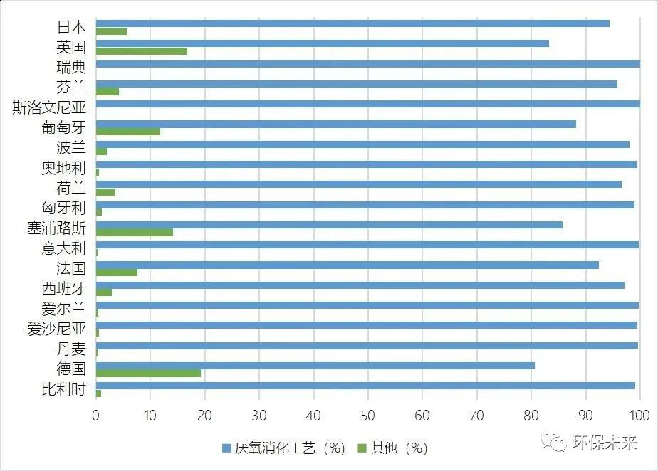 由圖1可以看出,目前發(fā)達(dá)國家的廚余垃圾處理技術(shù)主要以厭氧消化為主,約占市場(chǎng)份額的9成左右。其主要原因是相比于堆肥等其他處理技術(shù),厭氧消化技術(shù)更加環(huán)保和先進(jìn),受到業(yè)內(nèi)的廣泛關(guān)注,逐步形成一套成熟的產(chǎn)業(yè)鏈,進(jìn)而得到市場(chǎng)的認(rèn)可和推廣。