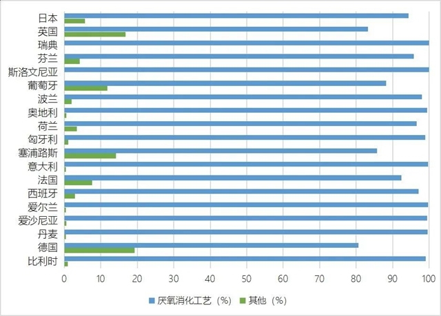 由圖1可以看出,目前發(fā)達國家的廚余垃圾處理技術主要以厭氧消化為主,約占市場份額的9成左右。其主要原因是相比于堆肥等其他處理技術,厭氧消化技術更加環(huán)保和先進,受到業(yè)內的廣泛關注,逐步形成一套成熟的產業(yè)鏈,進而得到市場的認可和推廣。