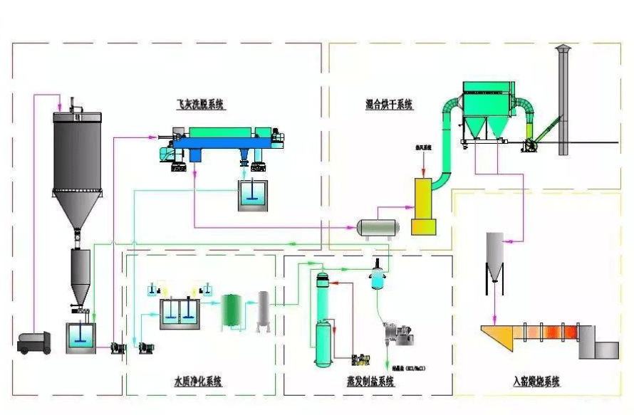 飛灰水洗工藝起源于水泥窯協(xié)同處置危險廢物?!端喔G協(xié)同處置固體廢物污染控制標(biāo)準(zhǔn)》(GB 30485-2013)發(fā)布后,利用水泥窯進行飛灰處置成為了許多填埋用地不足的外地城市,如北京、杭州、蕪湖等,普遍采用的新方式。由于水泥窯對入窯物料有嚴(yán)格的氯含量控制要求,針對具有高含氯特性的焚燒飛灰,也逐漸形成了“多級逆流漂洗+蒸發(fā)制鹽”的預(yù)處理工藝。生活垃圾焚燒飛灰水洗提鹽工藝由飛灰洗脫系統(tǒng)、水質(zhì)凈化系統(tǒng)、蒸發(fā)制鹽系統(tǒng)和烘干系統(tǒng)等4大系統(tǒng)組成。目前的工藝已經(jīng)能實現(xiàn)自動連續(xù)下料,水洗效果穩(wěn)定,用水量小,重金屬和二噁英轉(zhuǎn)移率低,運行穩(wěn)定,自動化程度高等。經(jīng)預(yù)處理后的飛灰含氯量可穩(wěn)定達到≤1%。