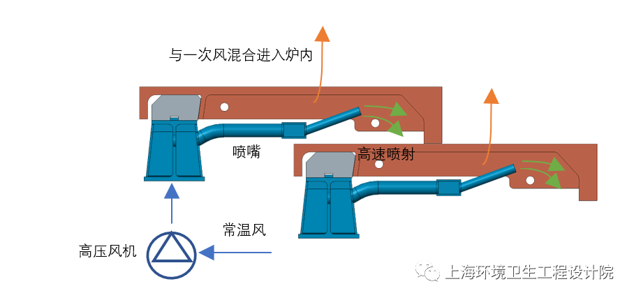 強(qiáng)制風(fēng)冷依靠風(fēng)管引入常溫高壓冷卻空氣,通過(guò)噴管高速吹掃爐排片高溫區(qū)域,局部溫度平均降低30℃~50℃,從而避免爐排片局部高溫?zé)龘p。上海環(huán)境院的風(fēng)冷爐排系統(tǒng)如圖5所示,常溫空氣經(jīng)過(guò)高壓風(fēng)機(jī)吹掃爐排片后與一次風(fēng)混合進(jìn)入焚燒爐參與燃燒,該設(shè)計(jì)不僅結(jié)構(gòu)簡(jiǎn)單,而且便于控制調(diào)節(jié),靈活可靠。