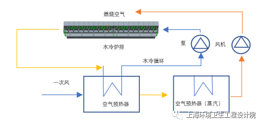 水冷爐排系統(tǒng)熱量可以用于加熱一次風(fēng),后經(jīng)過(guò)一次風(fēng)預(yù)熱器進(jìn)入焚燒爐內(nèi)燃燒,實(shí)現(xiàn)循環(huán)熱能利用,從而降低熱損失,詳見(jiàn)附圖6。