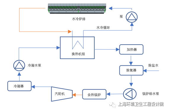 水冷爐排系統(tǒng)熱量也可以進(jìn)入鍋爐循環(huán)水系統(tǒng)用于驅(qū)動(dòng)汽輪機(jī)組詳見(jiàn)附圖7,從而實(shí)現(xiàn)熱量循環(huán)利用。總體而言,水冷系統(tǒng)能夠帶走熱負(fù)荷2-3%,降低系統(tǒng)熱損失,增加焚燒廠發(fā)電量。