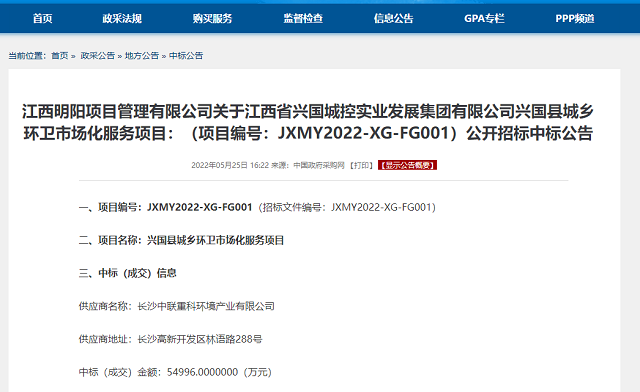 日前,江西興國(guó)縣城鄉(xiāng)環(huán)衛(wèi)市場(chǎng)化服務(wù)項(xiàng)目發(fā)布中標(biāo)結(jié)果公告,長(zhǎng)沙中聯(lián)重科環(huán)境產(chǎn)業(yè)有限公司(為盈峰環(huán)境子公司),中標(biāo)(成交)金額54996萬(wàn)元。
