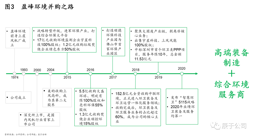 為加速轉(zhuǎn)型,作為“門外漢”的盈峰環(huán)境通過并購切入環(huán)保市場,先后收購宇星科技、綠色東方、大盛環(huán)球、亮科環(huán)保、順控環(huán)境等,致力于打造成為“高端裝備制造+綜合環(huán)境服務(wù)商”(見圖3)。