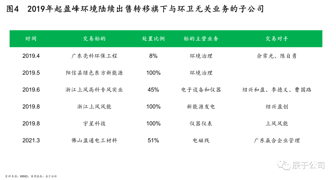 另一方面果斷剝離非環(huán)衛(wèi)相關(guān)業(yè)務(wù)。2019年起,盈峰環(huán)境陸續(xù)出售轉(zhuǎn)移旗下與環(huán)衛(wèi)無關(guān)業(yè)務(wù)的子公司,剝離的主要對象為低利潤或者邊緣業(yè)務(wù),如電磁線業(yè)務(wù)利潤率低,風(fēng)機(jī)與環(huán)境治理業(yè)務(wù)市場占有率低,行業(yè)地位低,都不利于公司主業(yè)競爭力的提升;剝離的主要方式為剝離公司而非業(yè)務(wù),以環(huán)境監(jiān)測業(yè)務(wù)為例,雖然宇星科技被剝離,但是雙方明確五年內(nèi),乙方、標(biāo)的公司及宇星科技不得從事環(huán)境監(jiān)測業(yè)務(wù),宇星科技相關(guān)無形資產(chǎn)授權(quán)盈峰使用,不影響公司相關(guān)業(yè)務(wù)繼續(xù)拓展(見圖4)。