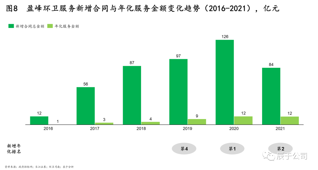 上述“裝備帶動服務(wù)”的業(yè)務(wù)協(xié)同戰(zhàn)略成效顯著,盈峰接連斬獲多個大型環(huán)衛(wèi)項(xiàng)目,如78億的深圳市寶安區(qū)環(huán)衛(wèi)一體化PPP項(xiàng)目、10.3億的淮北市環(huán)衛(wèi)一體化特許經(jīng)營項(xiàng)目等。憑著“拿大單”“拿明星項(xiàng)目”,盈峰的環(huán)衛(wèi)服務(wù)業(yè)務(wù)發(fā)展迅速,近年來在環(huán)衛(wèi)業(yè)務(wù)市場的地位也有了顯著提升(見圖8)。增量來看,2020年,盈峰環(huán)境環(huán)衛(wèi)服務(wù)新增合同總額、新增年化合同額均位列全國前列;存量來看,截至2021年,盈峰環(huán)境運(yùn)營的環(huán)衛(wèi)服務(wù)項(xiàng)目累計(jì)合同總額達(dá)到459億,待執(zhí)行合同總額達(dá)383億,位居行業(yè)前三,可持續(xù)經(jīng)營能力名列前茅。