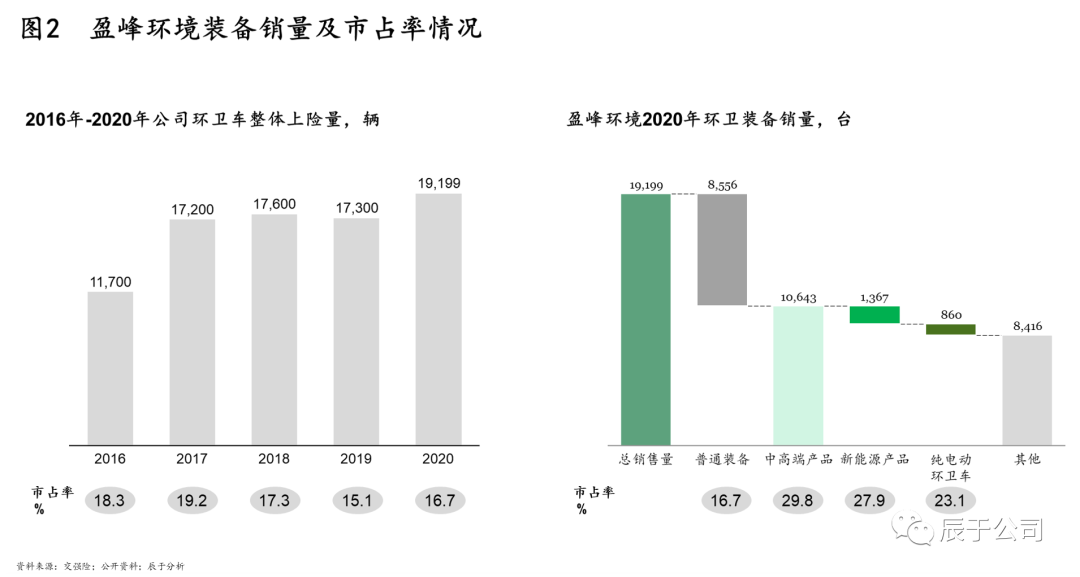 盈峰環(huán)境2015年轉(zhuǎn)型進(jìn)入環(huán)保市場,用短短四年的時間就實(shí)現(xiàn)了營收上百億的目標(biāo)。2021年收入達(dá)118億元,凈利潤7.3億元,截至2021年末凈資產(chǎn)172.5億元(見圖1)。環(huán)衛(wèi)裝備和環(huán)衛(wèi)服務(wù)是盈峰環(huán)境的兩大業(yè)務(wù)板塊,2021年兩者占營收總額近八成,兩者毛利潤占總額的55%。其中,環(huán)衛(wèi)裝備自2016年起年銷量便達(dá)上萬臺,同時增速明顯,已連續(xù)21年處于國內(nèi)環(huán)衛(wèi)裝備行業(yè)銷售額第一名。在中高端環(huán)衛(wèi)裝備市場優(yōu)勢則更加明顯,有超過55%的環(huán)衛(wèi)裝備銷量由中高端產(chǎn)品貢獻(xiàn),智慧裝備、新能源裝備等市占率也穩(wěn)居國內(nèi)行業(yè)前列(見圖2)。截至2021年底,在手環(huán)衛(wèi)服務(wù)項(xiàng)目179個,遍布全國26個省市,年?duì)I收30余億,較上年同期增長54%,無論是存量市場還是增量市場均位居行業(yè)前三。國內(nèi)發(fā)展勢頭強(qiáng)勁的同時,也在東南亞、非洲、歐洲等海外市場進(jìn)行了嘗試:2020年海外業(yè)務(wù)實(shí)現(xiàn)營收5600萬元,在歐洲,通過收購意大利當(dāng)?shù)仄髽I(yè)切入市場,2020年初斬獲羅馬環(huán)衛(wèi)超1億元訂單,并向意周邊國家拓展;在東南亞與非洲,借助國家“一帶一路”政策,目前已在印尼、柬埔寨、老撾、加納等國家中標(biāo)項(xiàng)目。本文試圖抽絲剝繭,剖析盈峰環(huán)境的發(fā)展歷程,總結(jié)其不走尋常路、異軍突起中國環(huán)衛(wèi)市場的成功因素,為各類企業(yè)、尤其是環(huán)衛(wèi)相關(guān)企業(yè)轉(zhuǎn)型發(fā)展提供啟迪和思考。盈峰環(huán)境異軍突起的四大關(guān)鍵