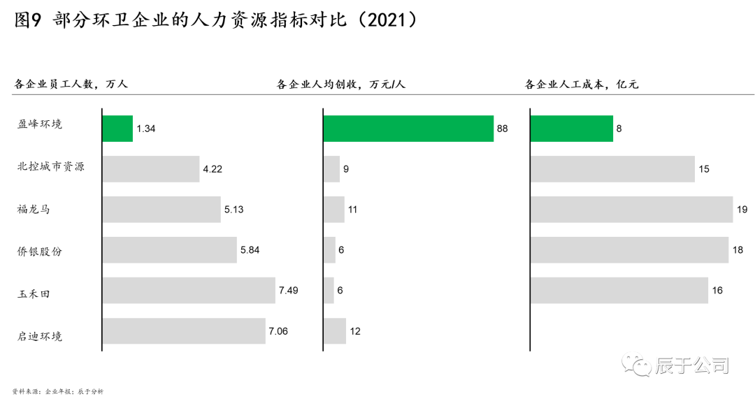 此外,這一模式也讓盈峰環(huán)境跳出了“環(huán)衛(wèi)企業(yè)=人多、人均創(chuàng)收低、技術(shù)含量低”的傳統(tǒng)環(huán)衛(wèi)企業(yè)形象。眾所周知,傳統(tǒng)環(huán)衛(wèi)屬勞動密集產(chǎn)業(yè),企業(yè)多以人員投入多、人均創(chuàng)收低、技術(shù)投入低等模式運(yùn)營,機(jī)械化程度不足。而盈峰憑借裝備領(lǐng)域積累的技術(shù)優(yōu)勢,在包括兩大深圳項(xiàng)目在內(nèi)的眾多項(xiàng)目運(yùn)營中,應(yīng)用了自主研發(fā)的全球首批智能小型環(huán)衛(wèi)機(jī)器人編隊(duì),大大提升項(xiàng)目機(jī)械化率,也使項(xiàng)目的人均產(chǎn)值顯著攀升(見圖9)。