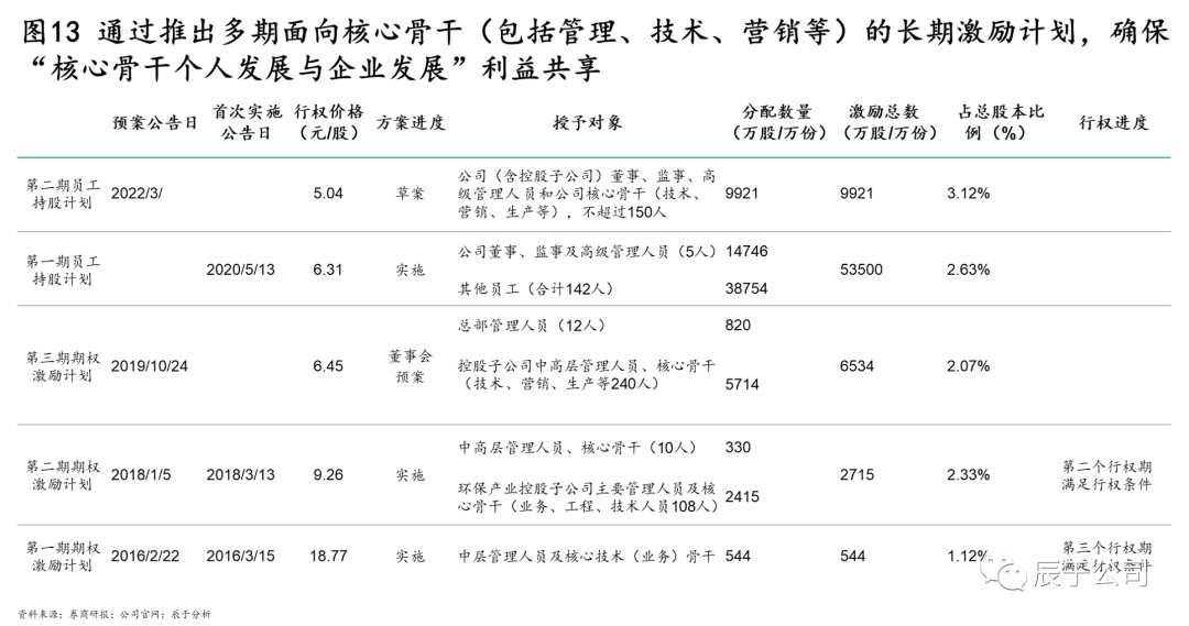 二是政策機(jī)制支持方面。盈峰環(huán)境引入美的經(jīng)驗(yàn),通過推出多期面向核心骨干(包括管理、技術(shù)、營銷等)的長期激勵計(jì)劃,確?!昂诵墓歉蓚€人發(fā)展與企業(yè)發(fā)展”利益共享(見圖13)。