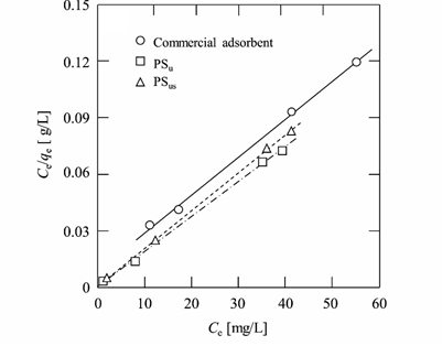 圖7 PSu、PSus和商用吸附劑對(duì)Pb2+的Langmuir吸附等溫線(吸附劑的濃度為60 mg·L-1,Pb2+的初始濃度為0.1~0.6 mmol·L-1,實(shí)驗(yàn)溫度為25℃)(來自原文)