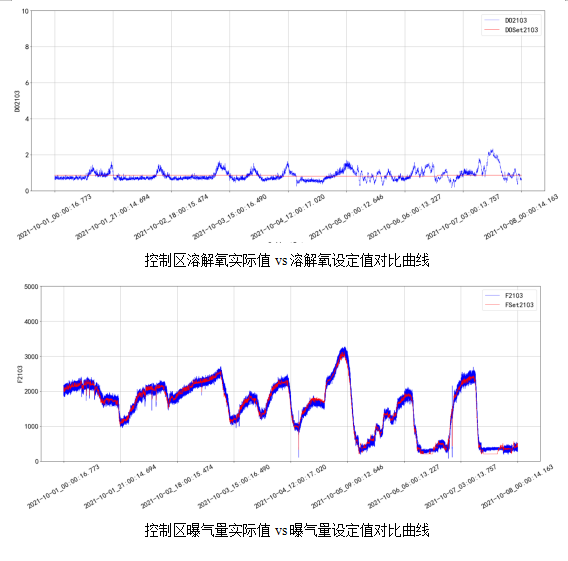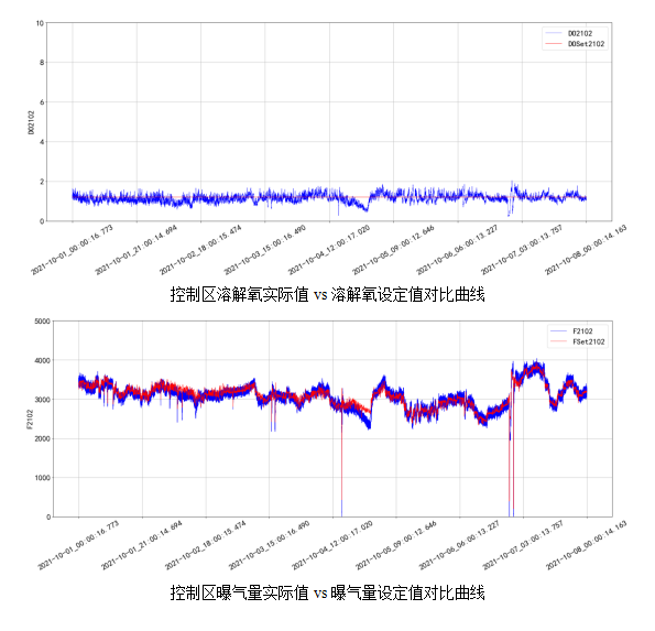下圖為使用精確曝氣系統(tǒng)后連續(xù)一個月和連續(xù)一周的各溶解氧控制區(qū)溶解氧濃度與氣體流量控制曲線,通過溶解氧控制效果圖可看出,受控溶解氧能夠在設(shè)定目標值一定范圍內(nèi)波動,且設(shè)定值與實際值吻合度較好,反映不同溶解氧控制區(qū)的溶解氧濃度滿足控制要求。