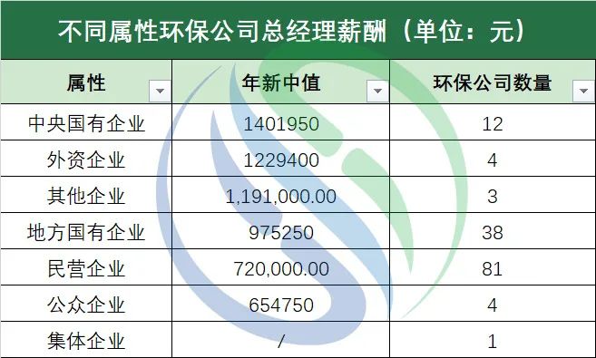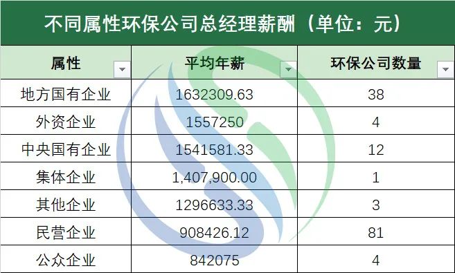 “固廢>水務(wù)”這一趨勢和過去兩年的環(huán)保上市公司業(yè)績趨勢一致。中國水網(wǎng)2020年與2021年的環(huán)保上市公司年報(bào)數(shù)據(jù)統(tǒng)計(jì)結(jié)果顯示,連續(xù)兩年,固廢處置行業(yè)的營業(yè)收入與凈利潤雙雙超過水務(wù)行業(yè)。近兩年隨著《“十四五”城鎮(zhèn)生活垃圾分類和處理設(shè)施發(fā)展規(guī)劃》、《“十四五”循環(huán)經(jīng)濟(jì)發(fā)展規(guī)劃》、《“十四五”時(shí)期“無廢城市”建設(shè)工作方案》等政策的出臺(tái),帶動(dòng)了固廢處置行業(yè)中環(huán)衛(wèi)、餐廚垃圾處理等細(xì)分領(lǐng)域的發(fā)展,從而在一定程度上影響了固廢處置行業(yè)環(huán)保上市公司總經(jīng)理們的年薪水平。不過水務(wù)行業(yè)的環(huán)保企業(yè)也不用太焦慮。進(jìn)入“十四五”時(shí)期以來,《關(guān)于推進(jìn)污水資源化利用的指導(dǎo)意見》、《“十四五”城鎮(zhèn)污水處理及資源化利用發(fā)展規(guī)劃》等一系列關(guān)于污水固廢資源化的政策頻繁出臺(tái)。在新建水務(wù)項(xiàng)目越來越少的情況下,國家也多次出臺(tái)措施助推存量資產(chǎn)盤活,為水務(wù)企業(yè)發(fā)展提供新的思路。此外,從事大氣治理、環(huán)保裝備制造、土壤修復(fù)與環(huán)境監(jiān)測等細(xì)分領(lǐng)域的企業(yè)隨著近年來國家政策的出臺(tái),乘著政策紅利的東風(fēng),其市場規(guī)模也日益突顯,相繼迎來發(fā)展高峰。如,《2021-2030年大氣污染治理行業(yè)發(fā)展展望報(bào)告》數(shù)據(jù)顯示,預(yù)計(jì)2021-2025年大氣污染治理市場規(guī)模約為1.6-1.8萬億元;在環(huán)保裝備制造領(lǐng)域,工信部、科技部、生態(tài)環(huán)境部三部門于今年1月21日聯(lián)合印發(fā)的《環(huán)保裝備制造業(yè)高質(zhì)量發(fā)展行動(dòng)計(jì)劃》提出,到2025年,環(huán)保裝備制造業(yè)產(chǎn)值要力爭達(dá)到1.3萬億元;再如第三方環(huán)境監(jiān)測運(yùn)營市場也逐步釋放,2021年上半年共注冊5.0萬家環(huán)境監(jiān)測類企業(yè),同比增長72.4%……種種政策和市場需求創(chuàng)造的紅利為這些細(xì)分領(lǐng)域帶來了積極因素。無論管理層還是普通員工,都是企業(yè)發(fā)展的一個(gè)“齒輪”,個(gè)人收入的多少都與企業(yè)經(jīng)營狀況掛鉤。環(huán)境產(chǎn)業(yè)各細(xì)分領(lǐng)域市場潛力的釋放與從業(yè)者薪資水平正如月球牽引著潮汐,潮漲潮落,有跡可循。筆者按照wind的分類,將143家環(huán)保公司分為中央國有企業(yè),地方國有企業(yè)、集體企業(yè)、民營企業(yè)、公眾企業(yè)、外資企業(yè)和其他企業(yè)七大類。根據(jù)統(tǒng)計(jì)數(shù)據(jù)顯示,地方國有企業(yè)以163.23萬元的總經(jīng)理平均年薪位列第一,外資企業(yè)和中央國有企業(yè)分別位列第二、三位,其總經(jīng)理平均年薪分別為155.73萬元和154.16萬元。前三整體年薪水平差距不大。