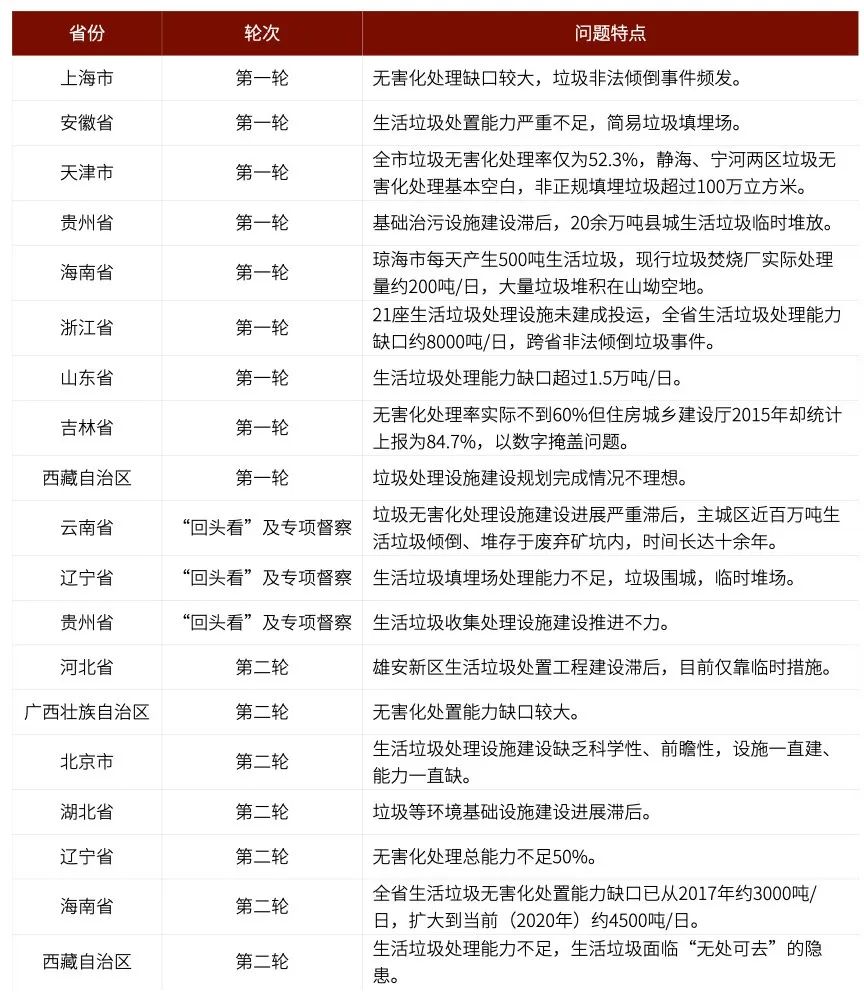 個別省區(qū)市歷史上無害化處理率低、無害化處理能力不足問題嚴(yán)重。其中,山東省在第一輪例行督察中被中央環(huán)保督察組反饋“生活垃圾處理能力缺口超過1.5萬噸/日”、云南省在“回頭看”及專項(xiàng)督察中被反饋“垃圾無害化處理設(shè)施建設(shè)進(jìn)展嚴(yán)重滯后,主城區(qū)近百萬噸生活垃圾傾倒、堆存于廢棄礦坑內(nèi),時間長達(dá)十余年”、北京市第二輪例行督察被反饋“生活垃圾處理設(shè)施建設(shè)缺乏科學(xué)性、前瞻性,設(shè)施一直建、能力一直缺”等。具體情況詳見表1。