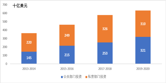 1.公共部門的氣候投融資資金主要來源于各類金融機構(gòu)、政府部門、氣候基金,其氣候投融資資金流量較2017/2018年增長了7%,基本穩(wěn)定在總額的51%(3210億美元)。