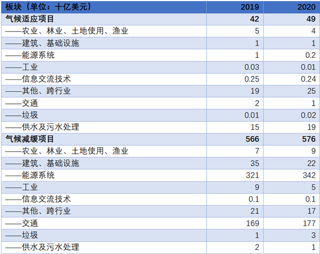 表1 2019-2020年全球氣候適應、減緩項目投融資規(guī)模(按用途劃分)