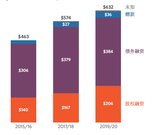 通常情況下,按照融資類型進行劃分,氣候融資工具主要包括債務融資工具、股權(quán)融資工具以及贈款,在2019/2020年度占氣候融資總量的比例分別為61%、33%及6%。