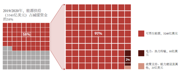 2019-2020年,90%可溯源的氣候投融資用于減緩氣候變化,平均每年達到5710億美元,比2017-2018年增加了340億美元左右。如下圖所示,減緩資金中,對于能源供給的投資是主要組成部分(3340億美元,58%),同時也占全部氣候融資資金的53%。盡管新冠肺炎疫情對全球經(jīng)濟產(chǎn)生了影響,但年平均與2017/2018年相比,2019/2020年的可再生能源投資保持穩(wěn)定,在全部能源融資資金中占比97%。值得注意的是,由于太陽能和風能技術(shù)的成本大幅降低,同樣的投資水平可以轉(zhuǎn)化為比2017/2018年更大的新增產(chǎn)能。