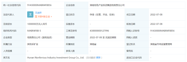 據(jù)企查查顯示信息,湖南有色產(chǎn)業(yè)投資集團(tuán)有限責(zé)任公司注冊(cè)資金為100億元,經(jīng)營(yíng)范圍包括經(jīng)營(yíng)范圍包含:礦產(chǎn)資源(非煤礦山)開(kāi)采;建設(shè)工程設(shè)計(jì);礦產(chǎn)資源勘查;金屬與非金屬礦產(chǎn)資源地質(zhì)勘探;測(cè)繪服務(wù);職業(yè)衛(wèi)生技術(shù)服務(wù);放射衛(wèi)生技術(shù)服務(wù);安全評(píng)價(jià)業(yè)務(wù);安全生產(chǎn)檢驗(yàn)檢測(cè);危險(xiǎn)廢物經(jīng)營(yíng);檢驗(yàn)檢測(cè)服務(wù);地質(zhì)災(zāi)害危險(xiǎn)性評(píng)估(依法須經(jīng)批準(zhǔn)的項(xiàng)目,經(jīng)相關(guān)部門批準(zhǔn)后方可開(kāi)展經(jīng)營(yíng)活動(dòng),具體經(jīng)營(yíng)項(xiàng)目以相關(guān)部門批準(zhǔn)文件或許可證件為準(zhǔn))一般項(xiàng)目:地質(zhì)勘查技術(shù)服務(wù);選礦;礦物洗選加工;再生資源加工;常用有色金屬冶煉;貴金屬冶煉;有色金屬鑄造;金屬礦石銷售;金屬材料銷售;新型金屬功能材料銷售;高性能有色金屬及合金材料銷售;新材料技術(shù)研發(fā);金屬?gòu)U料和碎屑加工處理;環(huán)保咨詢服務(wù);安全咨詢服務(wù);土壤污染治理與修復(fù)服務(wù);土壤環(huán)境污染防治服務(wù);水環(huán)境污染防治服務(wù);離岸貿(mào)易經(jīng)營(yíng);貿(mào)易經(jīng)紀(jì);國(guó)內(nèi)貿(mào)易代理;進(jìn)出口代理;工程和技術(shù)研究和試驗(yàn)發(fā)展;環(huán)境保護(hù)監(jiān)測(cè)等。