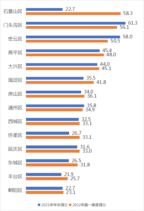 納入本期指數(shù)計(jì)算的北京市隨手拍共4235條,覆蓋十六個(gè)區(qū)3611個(gè)小區(qū),去除覆蓋度不足0.05%的順義區(qū)和平谷區(qū),十四區(qū)中得分最高的是石景山區(qū),58.3分,朝陽(yáng)區(qū)最低,23.1分,全市各區(qū)平均分39.3.,城六區(qū)平均分35.6分。和2021年年末相比,各區(qū)平均分上升了3.7分,城六區(qū)平均分上升了8.7分。14個(gè)區(qū)的得分有所增長(zhǎng),其中石景山區(qū)增幅最大,得益于1月以來(lái)石景山區(qū)為迎接2022年冬奧會(huì)、冬殘奧會(huì),區(qū)城管委推進(jìn)的監(jiān)督管理智能化、推進(jìn)引導(dǎo)宣傳精細(xì)化、推進(jìn)社會(huì)參與常態(tài)化等舉措。圖 21 北京市11區(qū)2022年第一季度垃圾分類指數(shù)得分