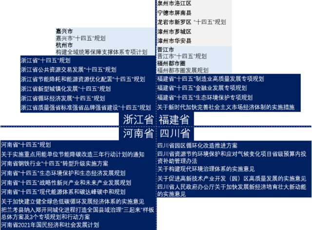 除試點四省外,全國其余省與自治區(qū)均積極響應(yīng)全國“十四五”規(guī)劃對用能權(quán)市場建設(shè)的要求。如下圖所示,我國大陸所有省份均在省級規(guī)劃中將用能權(quán)市場列入,在省級層面對用能權(quán)市場建設(shè)提供支持,多市在市級層面出臺政策與規(guī)劃,進(jìn)一步提高對用能權(quán)市場建設(shè)的支持力度。有關(guān)政策覆蓋生態(tài)環(huán)境保護(hù)、高碳行業(yè)低碳改造、產(chǎn)業(yè)轉(zhuǎn)型升級、金融、環(huán)境權(quán)益交易市場協(xié)調(diào)建設(shè)等多個領(lǐng)域,為我國建設(shè)全國用能權(quán)交易市場以通過市場化手段促進(jìn)產(chǎn)業(yè)提效轉(zhuǎn)型、推動綠色發(fā)展具有顯著促進(jìn)作用。