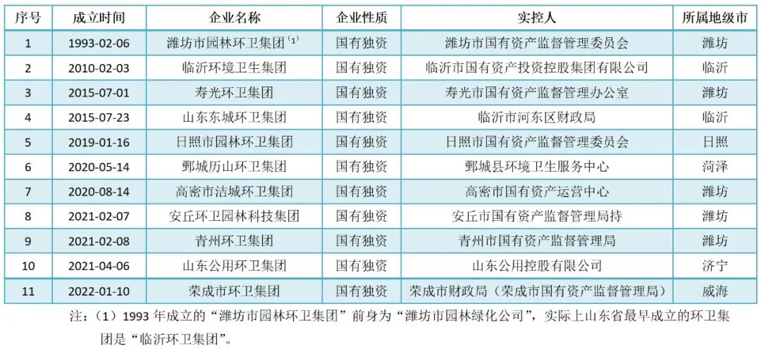 山東省共有16個地級市,企查查數(shù)據(jù)顯示,所有地級市均有國企涉足環(huán)衛(wèi)領域,但以“環(huán)衛(wèi)集團”命名,具備一定規(guī)模和知名度,且以本地環(huán)衛(wèi)作業(yè)單位為基礎改制而來的環(huán)衛(wèi)企業(yè)則只有11家。如表2所示。